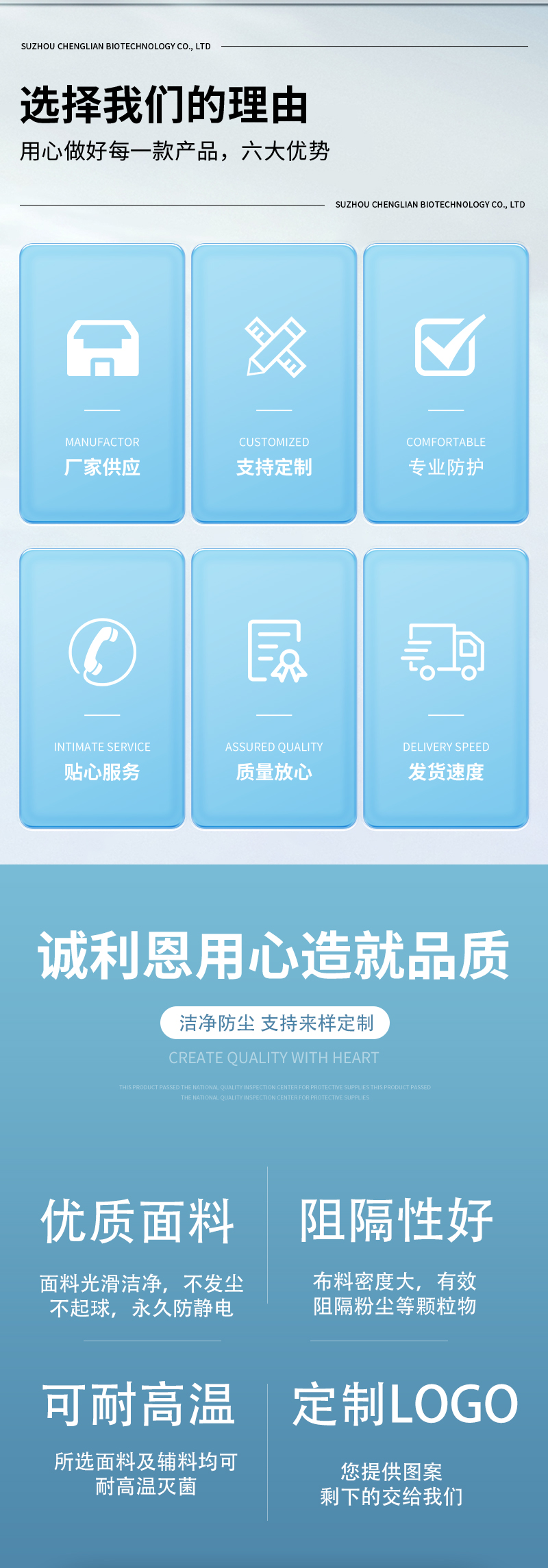 產品性能優勢:潔凈防塵、阻隔粉塵顆粒物、耐高壓濕熱滅菌、永久防靜電、立體剪裁、不起球、布面光潔
