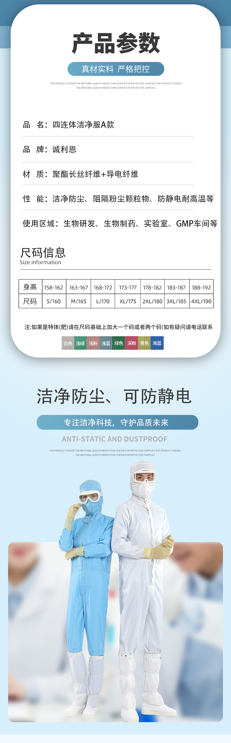 款式說明:四連體,上衣連帽子褲子連腳套;領口暗扣設計,更貼合面部使防護更嚴實。腰部松緊帶或抽繩設計,彎腰不束縛,穿著更為舒適。