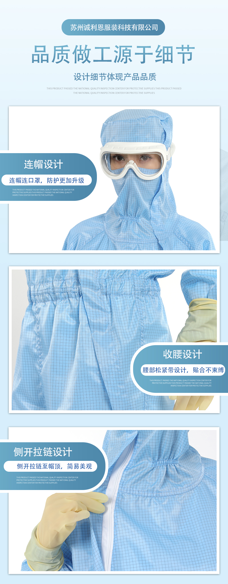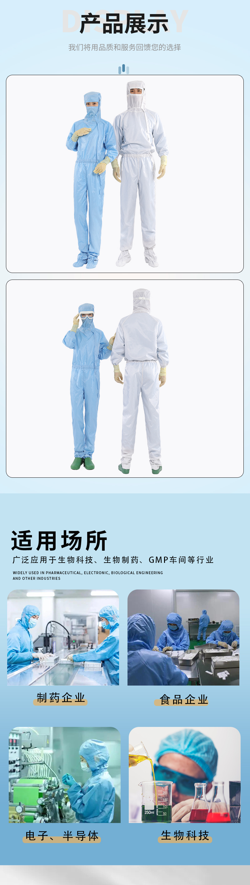 產品性能優勢:潔凈防塵、阻隔粉塵顆粒物、耐高壓濕熱滅菌、永久防靜電、立體剪裁、不起球、布面光潔